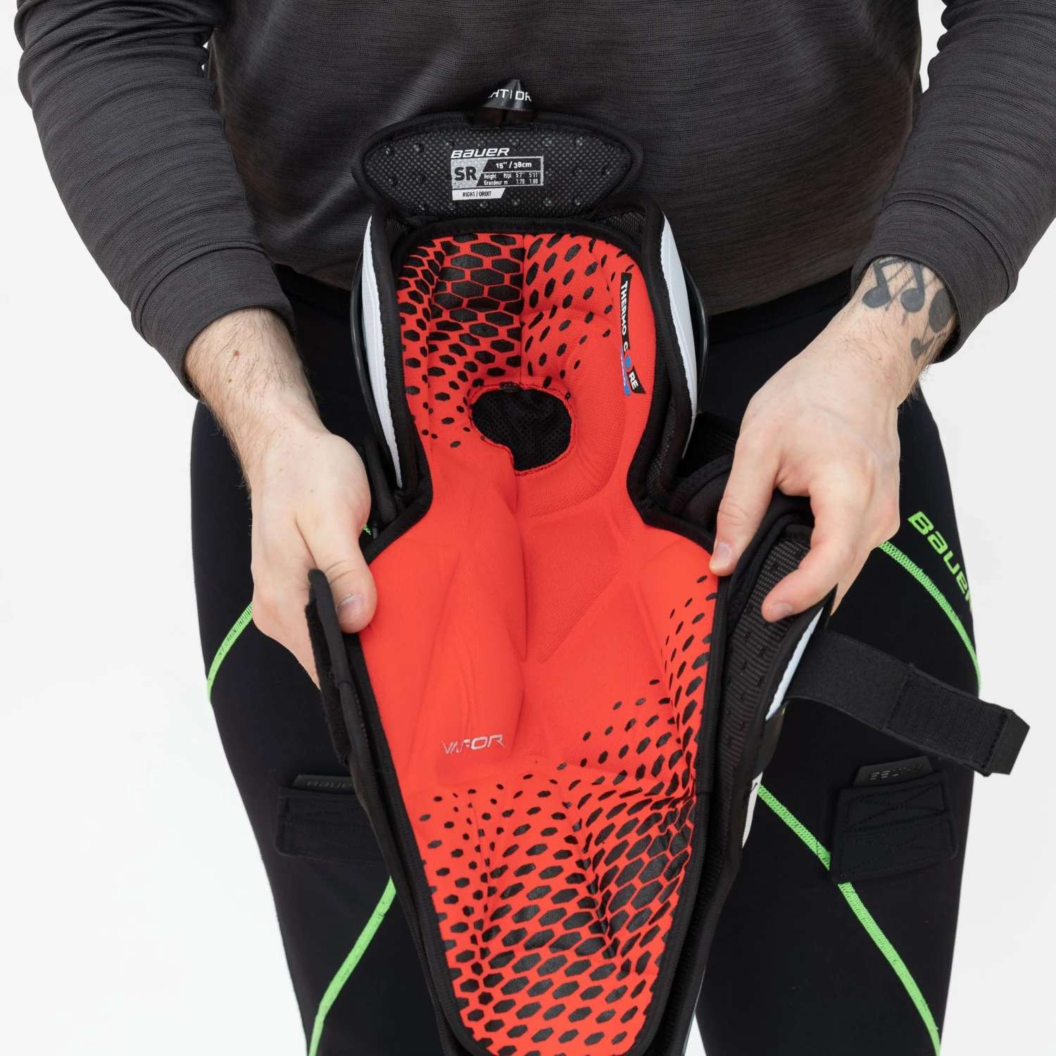The Vapor Shift Pro shin guards stick to the anatomically molded X-Lite Shield cap, as seen in the 2X series. This cap design contours around the leg for a closer fit, giving you better protection, a comfier feel, and a deeper fit. This innovation overall will help keep you nimble on the ice.