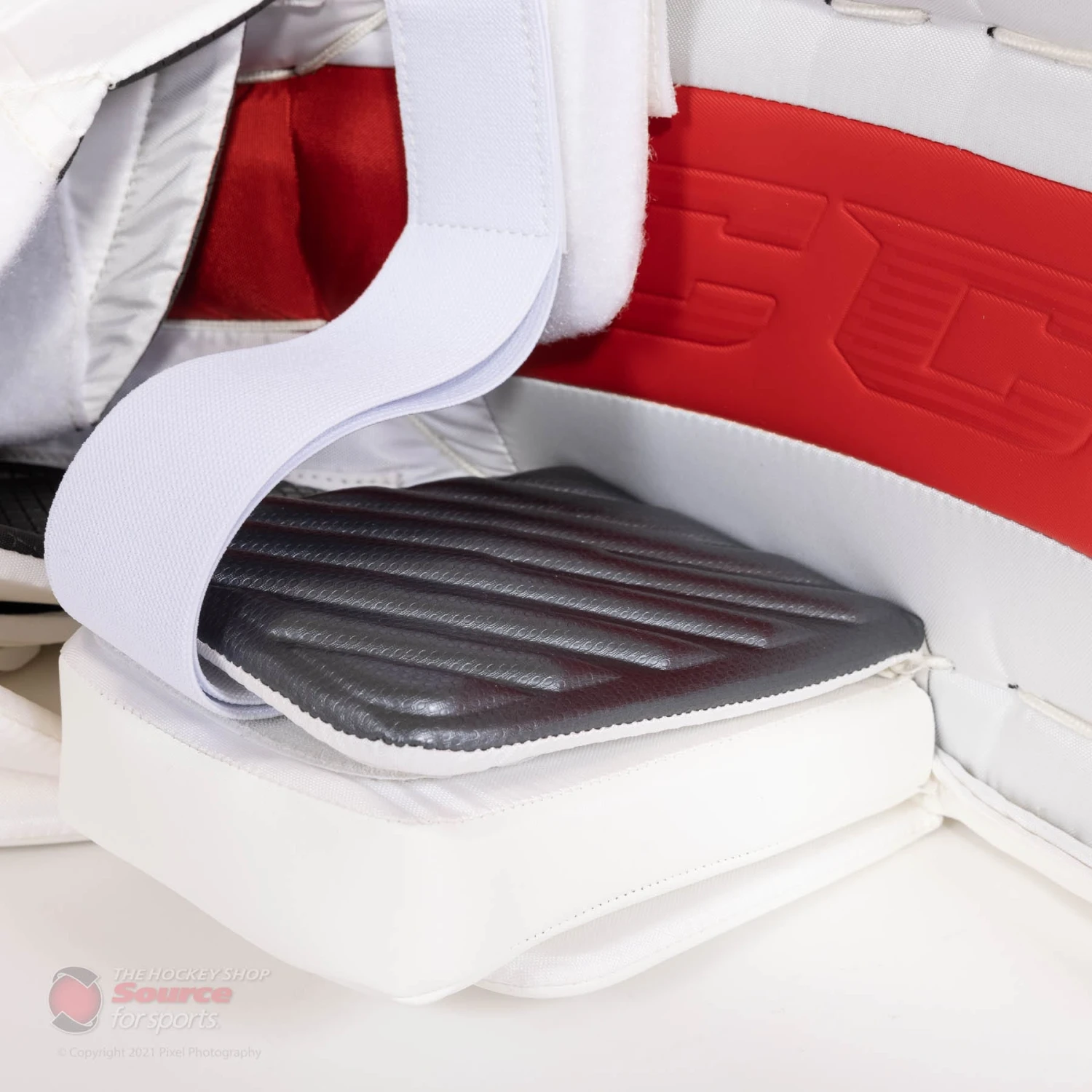 CCM uses recessed foam with a removable knee cradle wrap to allow customizability and comfort. This deep knee cradle is designed to help close the five-hole and prevent you from falling off the knee stack, while still having unrestricted mobility.
