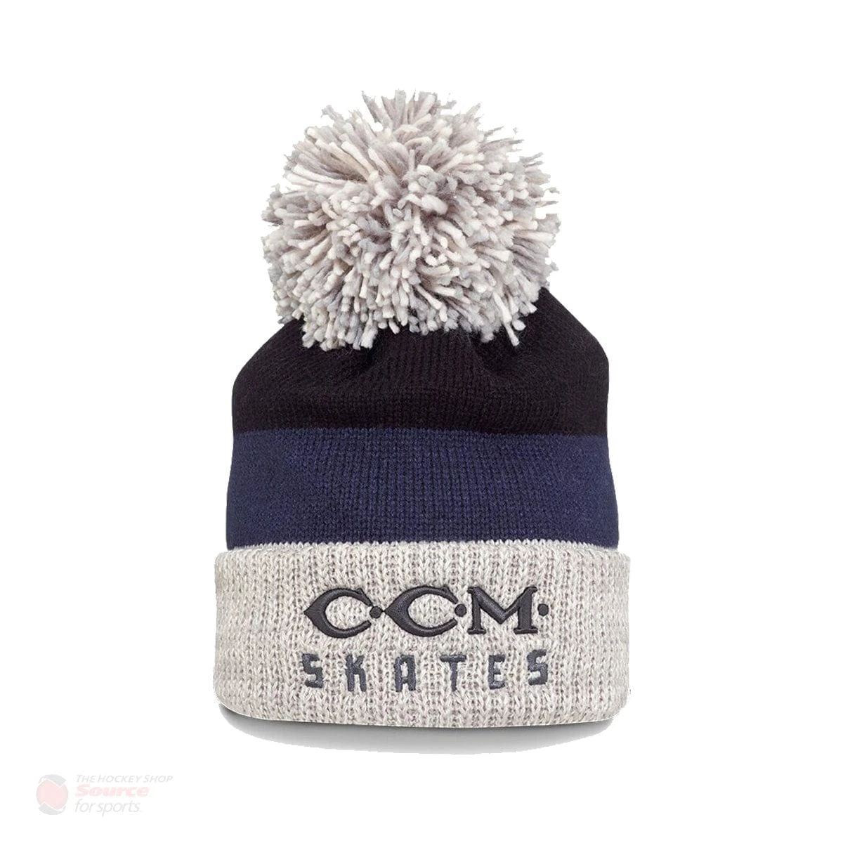 Cuffed knit with striping, a soft polar fleece lining and topped with a chunky single-color pom.