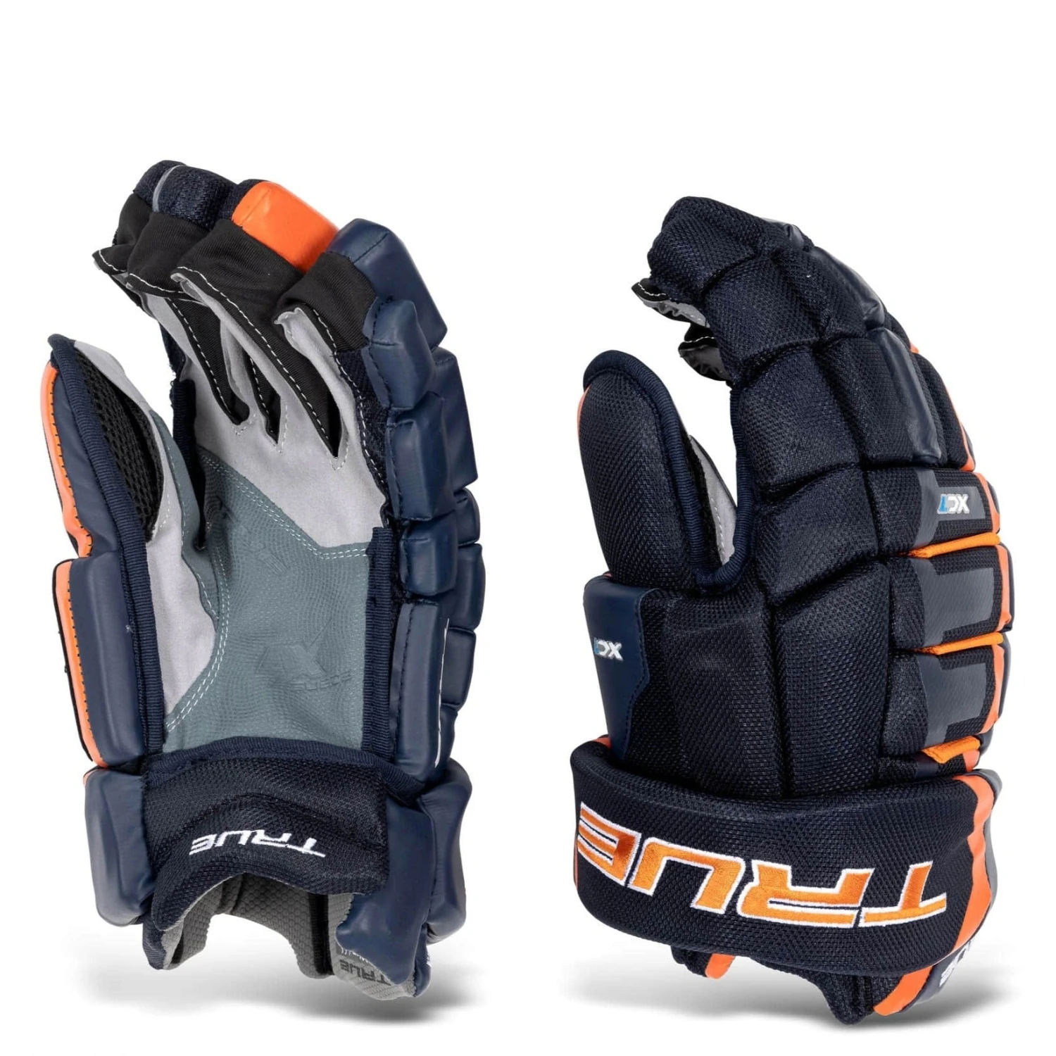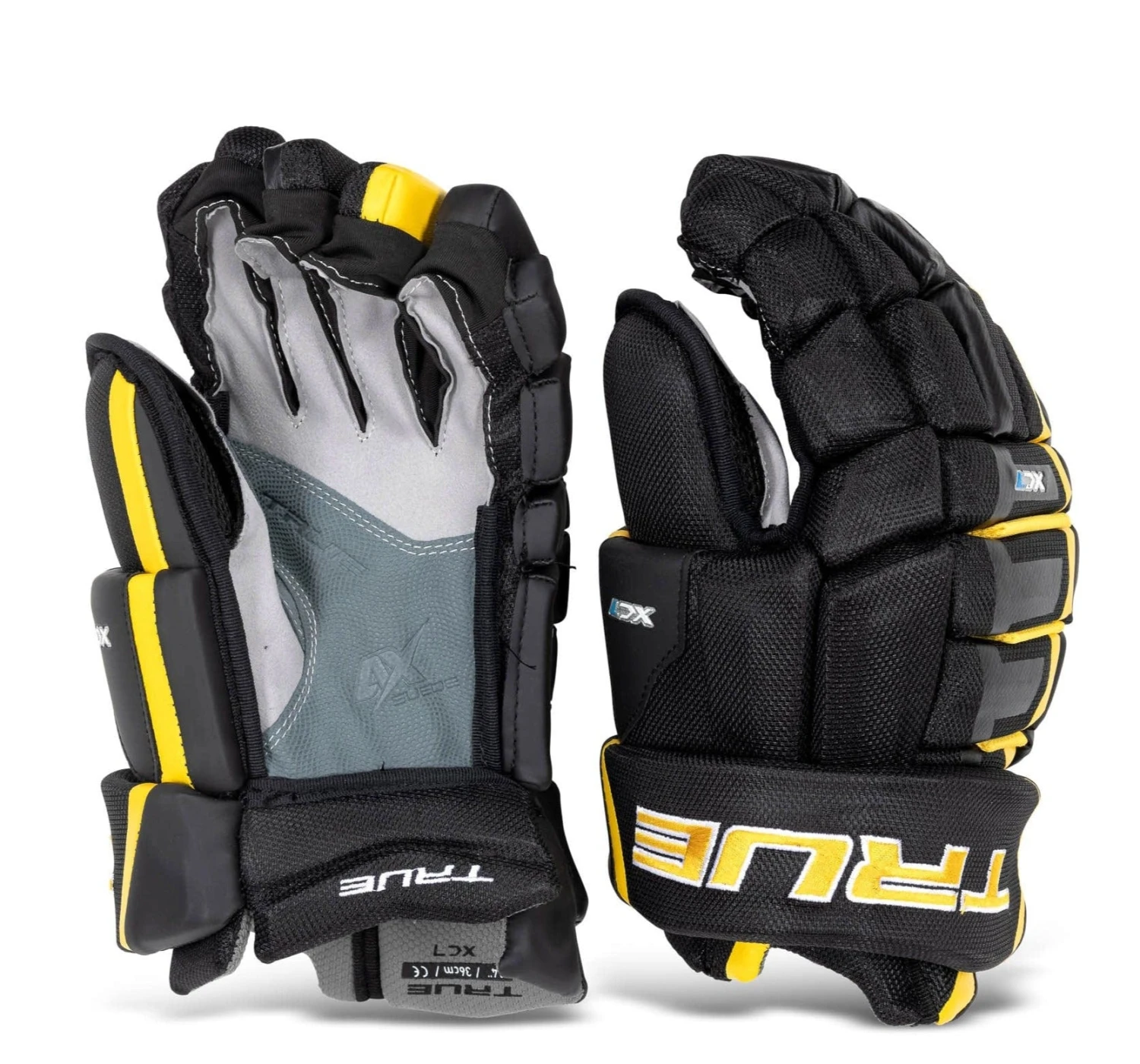 The TRUE XC7 Junior Hockey Gloves are available in sizes 8”-12”, and the following colours: Black, Black/Gold, Black/Orange, Black/Red, Black/White, Navy/Gold, Navy/Orange, Navy, Red/White/Blue, Red, and Royal/White