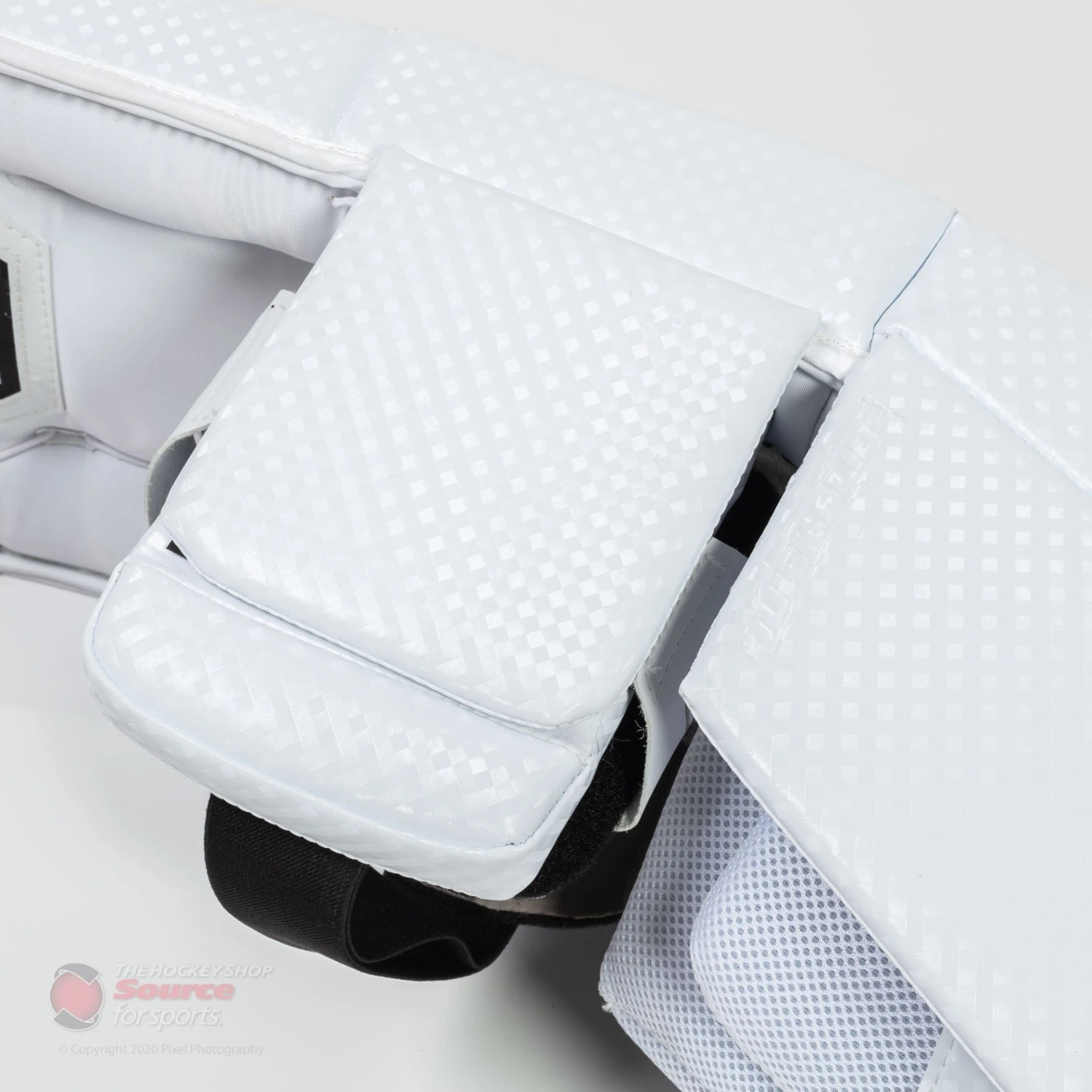 The V9 Pro features a redesigned strapping system and calf wrap allowing for a simpler, quicker and lighter system. Vaughn uses a velcro Reactive Rotation Control strap that sits on the upper calf to allow for quicker yet more controlled pad rotation while giving the pad a connected feel. The calf wrap uses a single velcro strap to seal its extended wings that offer better coverage over those of the VE8 shut. While still a fairly tight fitting leg channel, the V9 Pro has a widened inner leg cradle overall when compared to previous Velocity pads giving goals the feel of a tight fitting leg channel while offering the better rotation associated with a looser leg channel. Finally, the V9 Pro features a velcro bootstrap as well as the same bungee toe tie system seen on the SLR2 leg pads.